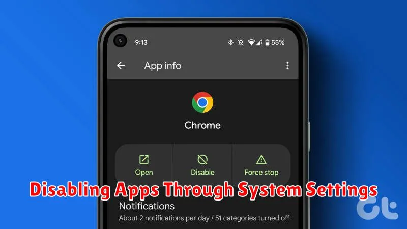 To disable an app, navigate to your device’s Settings. The exact path may vary slightly based on your Android version and manufacturer, but it generally involves accessing the Apps or Applications section. Here, you’ll find a list of all installed applications.