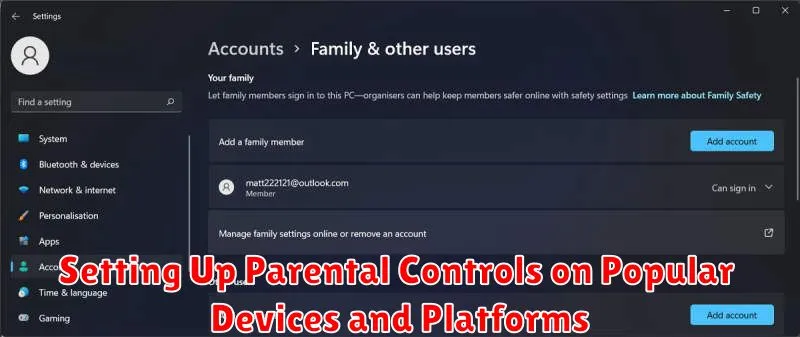 Windows: Access Family Options settings through your Microsoft account. Here you can set up individual accounts for your children, manage screen time, filter website content, and control game and app access.